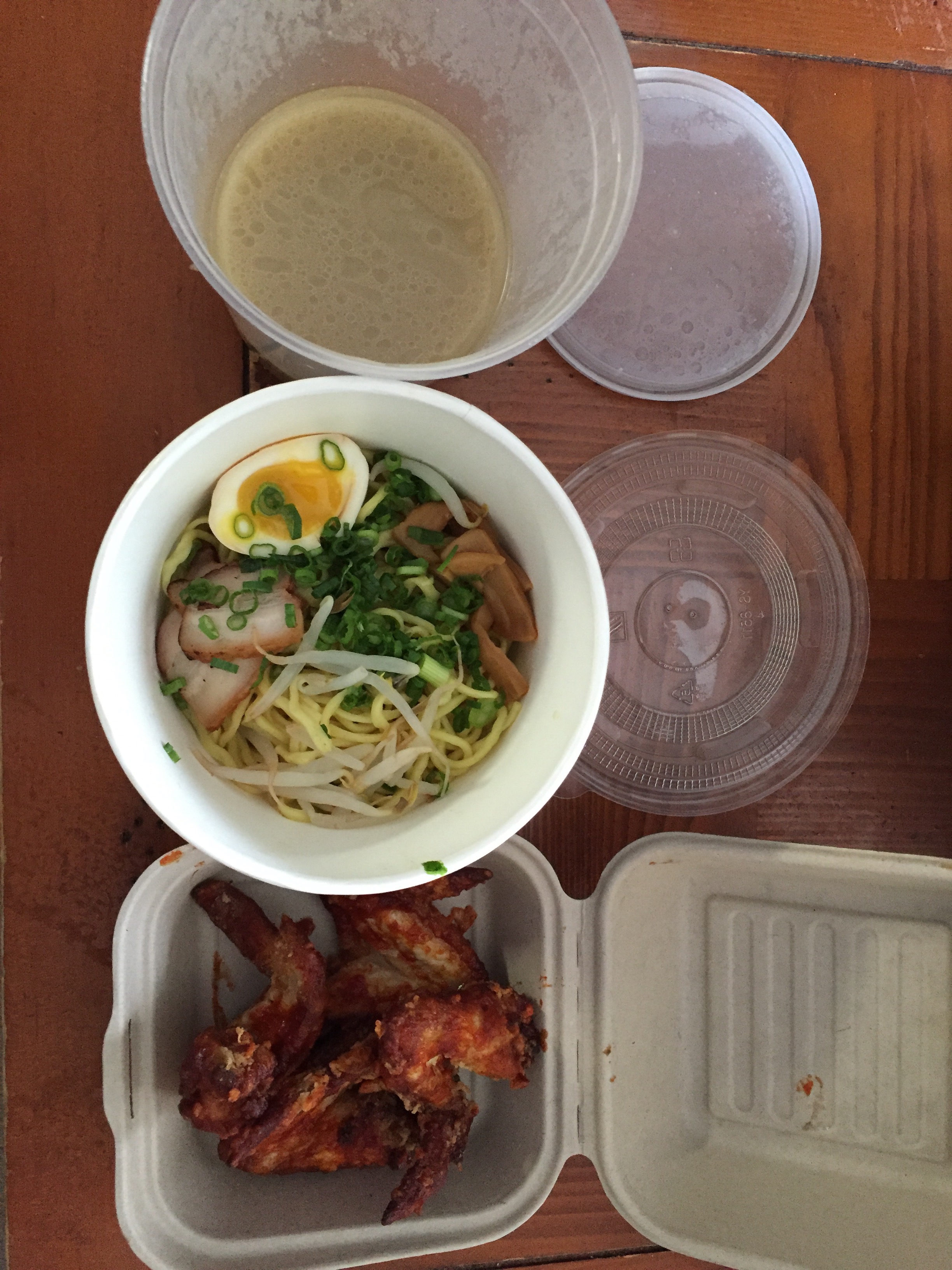 My initial visit to Flagship came as I was attempting to not get sick before a New Year’s Eve trip. Immediately I knew steaming broth would be the answer but didn’t want to potentially contaminate the masses. Enter the Flagship concept that by far does the best job with its take-out option.Separate container for broth, the rest of the tonkotsu ingredients including chashu (soy braised chicken or pork), menma (marinated bamboo shoots), moyashi (sprouts) and negi (green onions). At the time this also included an ajitama (soy-marinated) egg but a look at the current online menu does not include this inclusion cost-free. I also added a side of korean spicy wings because I’m a glutton for punishment.
