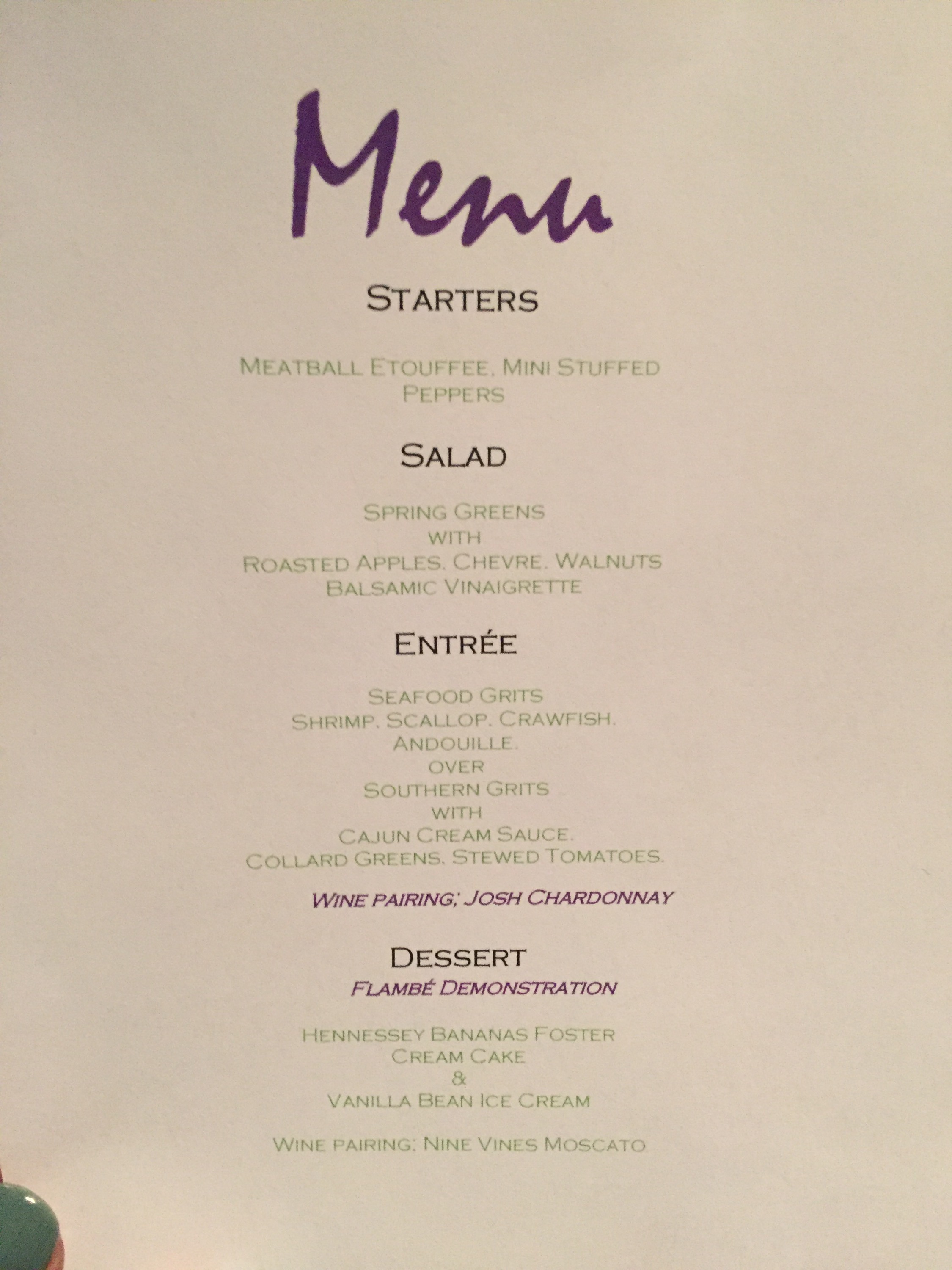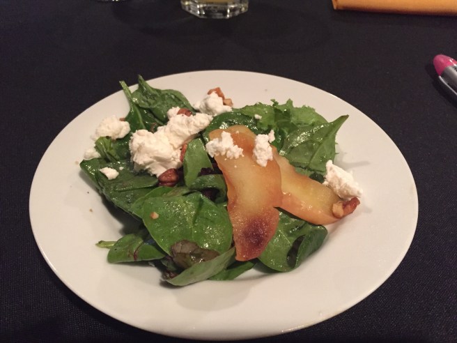 Objectively, this salad was great. I love chevre (goat cheese if you are like many who were in attendance who’d never had it) and balsamic vinaigrette together and the roasted apples were a good seasonal touch. Keeping that in mind I was a bit disappointed in this offering as it was very “safe” and I don’t think “cajun” or “creole” when given a spring green salad with goat cheese and balsamic.