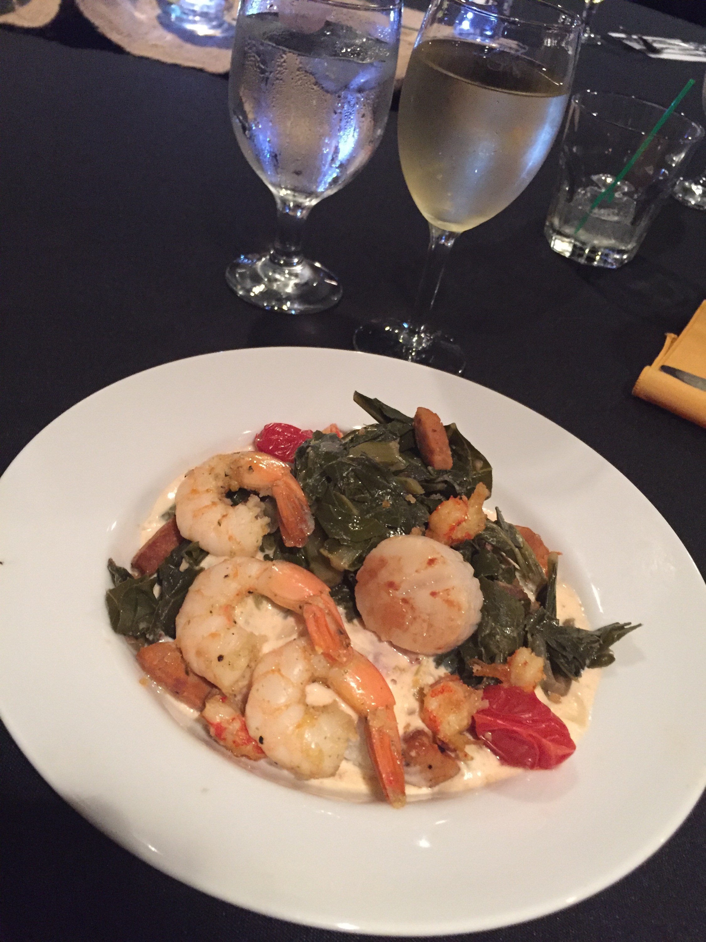 Seafood grits — shrimp, scallop, crawfish and andouille over southern grits with cajun cream sauce, collard greens & stewed tomatoes | Josh Chardonnay wine pair